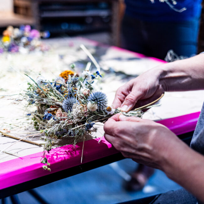 Wir bringen für euch mit, was unsere Werkstatt und das Trockenblumenlager hergeben und helfen, eure Ideen umzusetzen!