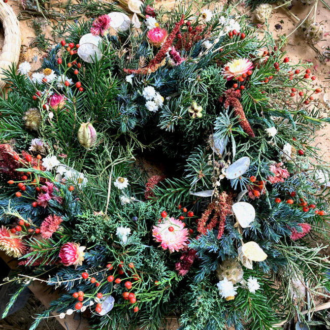 Lasst euch inspirieren von einem üppig, winterlichen Blumenbuffet, um euren eigenen Strohrömer zu bestücken oder einen ganz besonderen Trockenblumen-Adventskranz (s. Bild) zu kreieren!