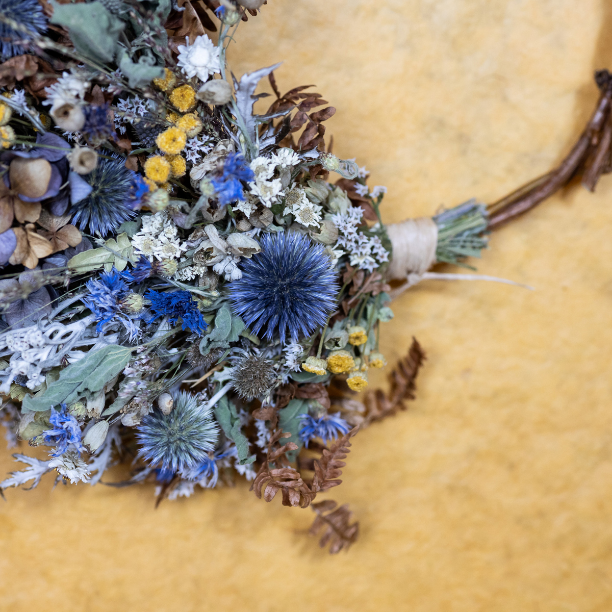 Wir verarbeiten Trockenblumen aus eigenem Anbau, die nicht gefärbt oder chemisch behandelt sind, sondern ganz natürlich getrocknet wurden. Sie bleiben über viele Monate und länger strahlend schön, wenn sie keiner Feuchtigkeit oder direktem Sonnenlicht ausgesetzt sind.