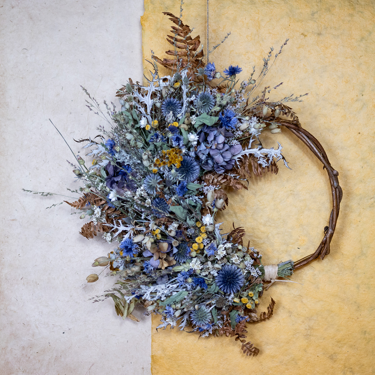 Nichts ist schöner, als ein üppiger Kranz aus getrockneten, zarten Blüten, Fruchtständen, Blättern und Gräsern. Bei unserem Flower-Loop bleibt ein Teil der Kranzunterlage, die aus Zweigen oder Reben besteht, sichtbar – wie die Sichel eines Mondes.
