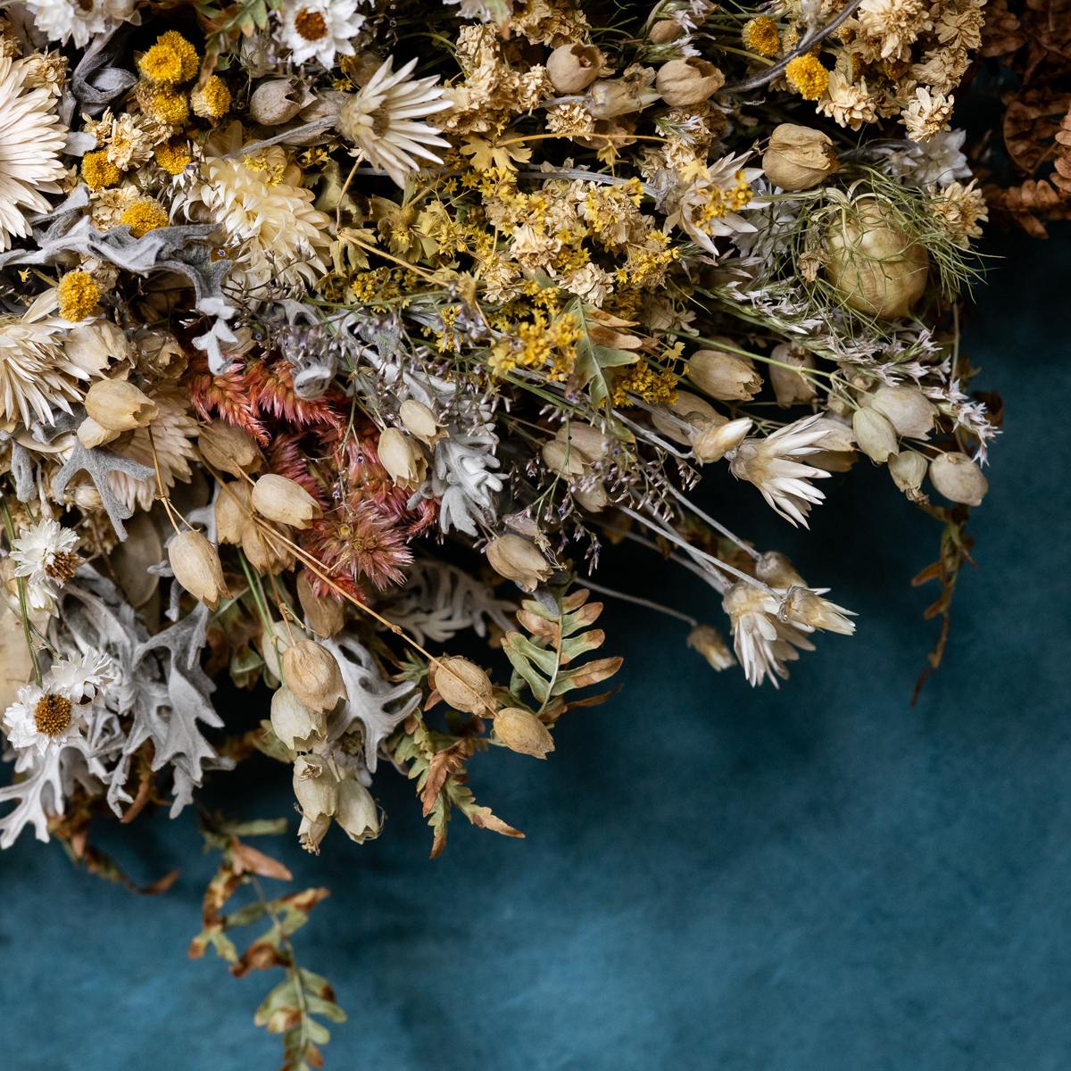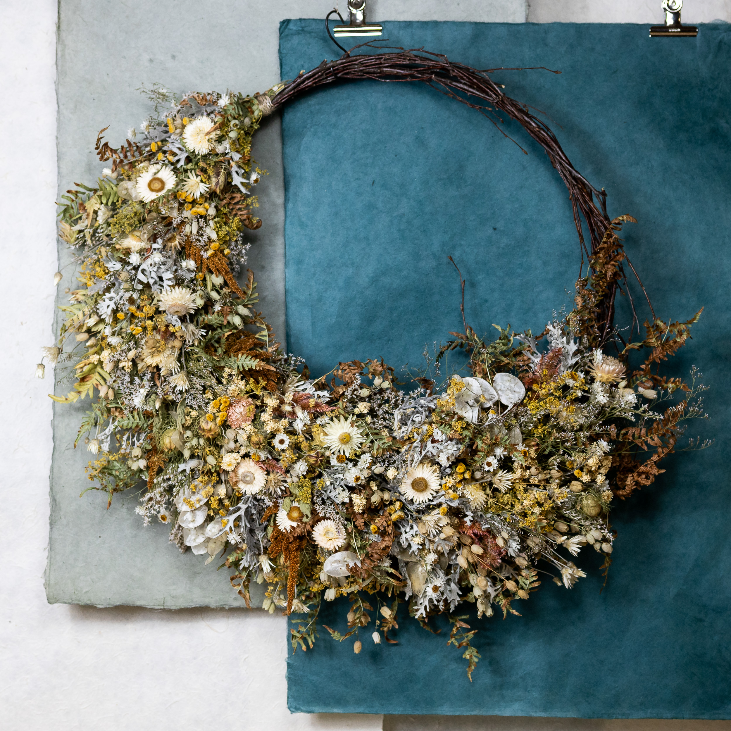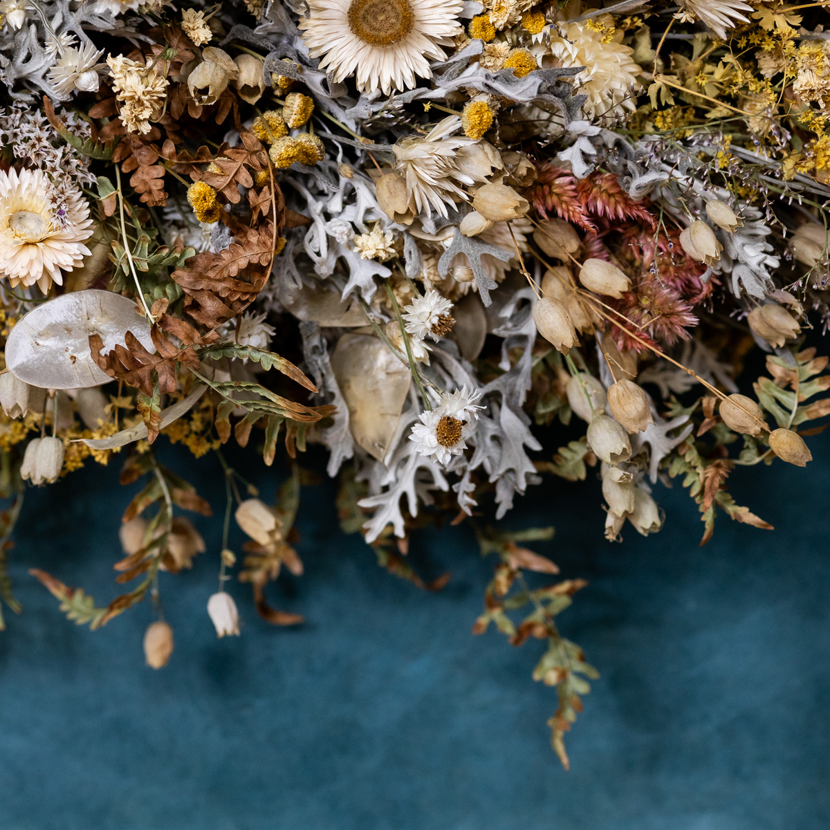 Ein wirklich üppiger Kranz aus getrockneten, zarten Blüten, Fruchtständen, Blättern und Gräsern ist unser Loop „Statement“. Wie bei all unseren Flower-Loops bleibt ein Teil der Kranzunterlage, die aus Zweigen oder Reben besteht, sichtbar – wie die Sichel eines Mondes.