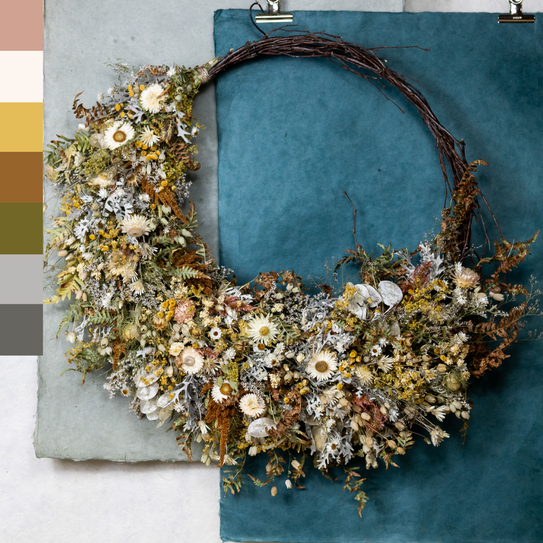 Gebt euren bevorzugten Farbstil für den Kranz bitte bei der Bestellung mit an. Als Referenz könnt ihr die Produktfotos unserer Loops nutzen (Natur, wie im Bild gezeigt/ Rot-Orange/ Blau/ Pink/ Gelb).