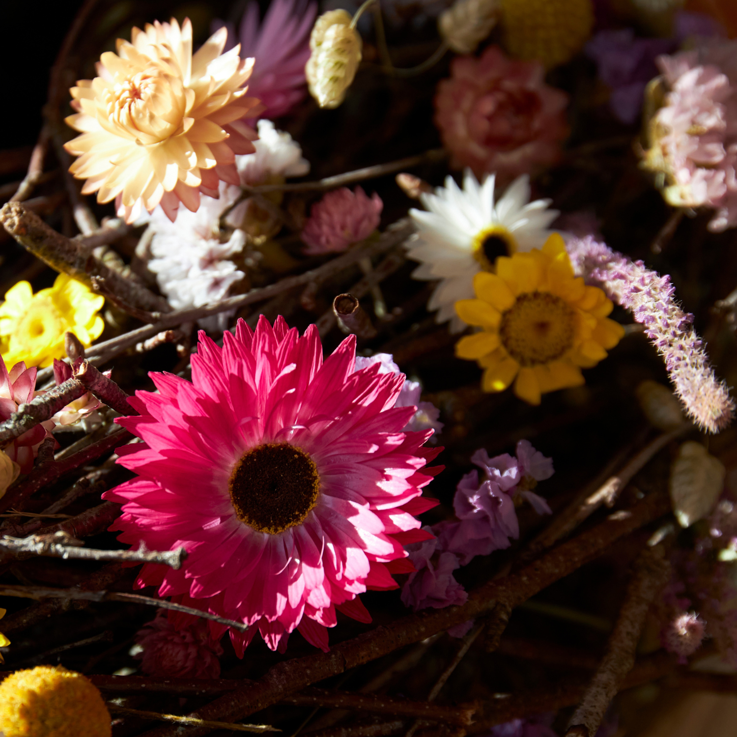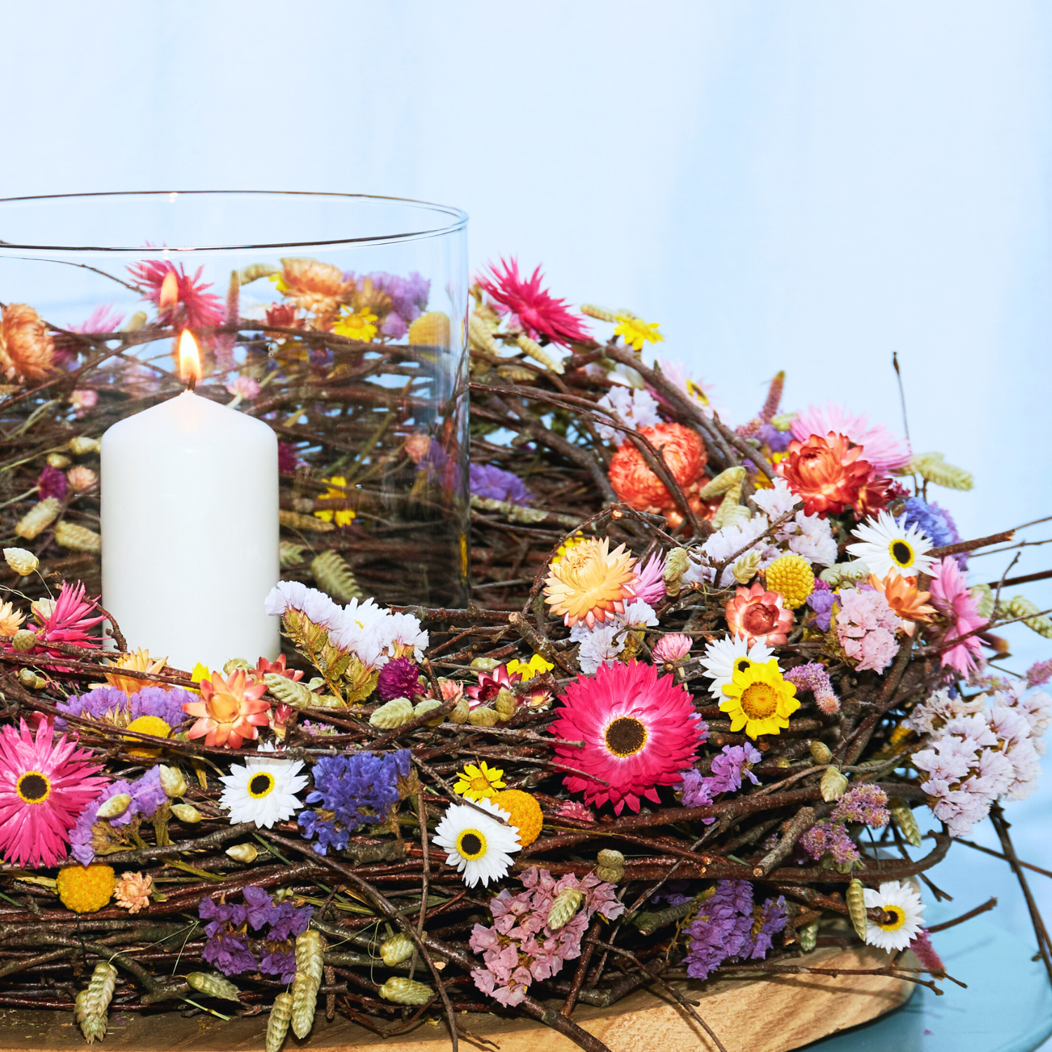 Der Frühling steht schon fast vor der Tür! Deshalb lade ich euch ein, mit mir strahlende Tür- oder Tischkränze zu fertigen – gesteckt, nicht gebunden! Mit Birkenreisig und strahlend bunten Trockenblumen. Lasst euch treiben in der Fülle an Farben und Strukturen!